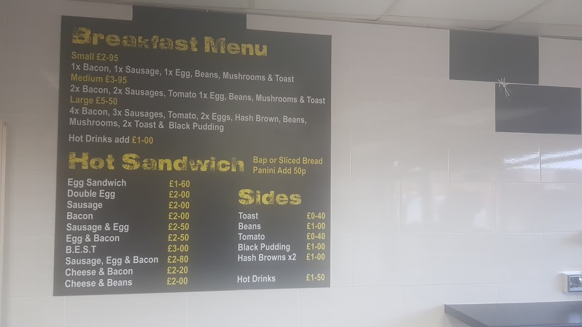 Sides complement the main items and include toast, beans, tomato, black pudding, and hash browns. Hot drinks are also available to accompany meals.